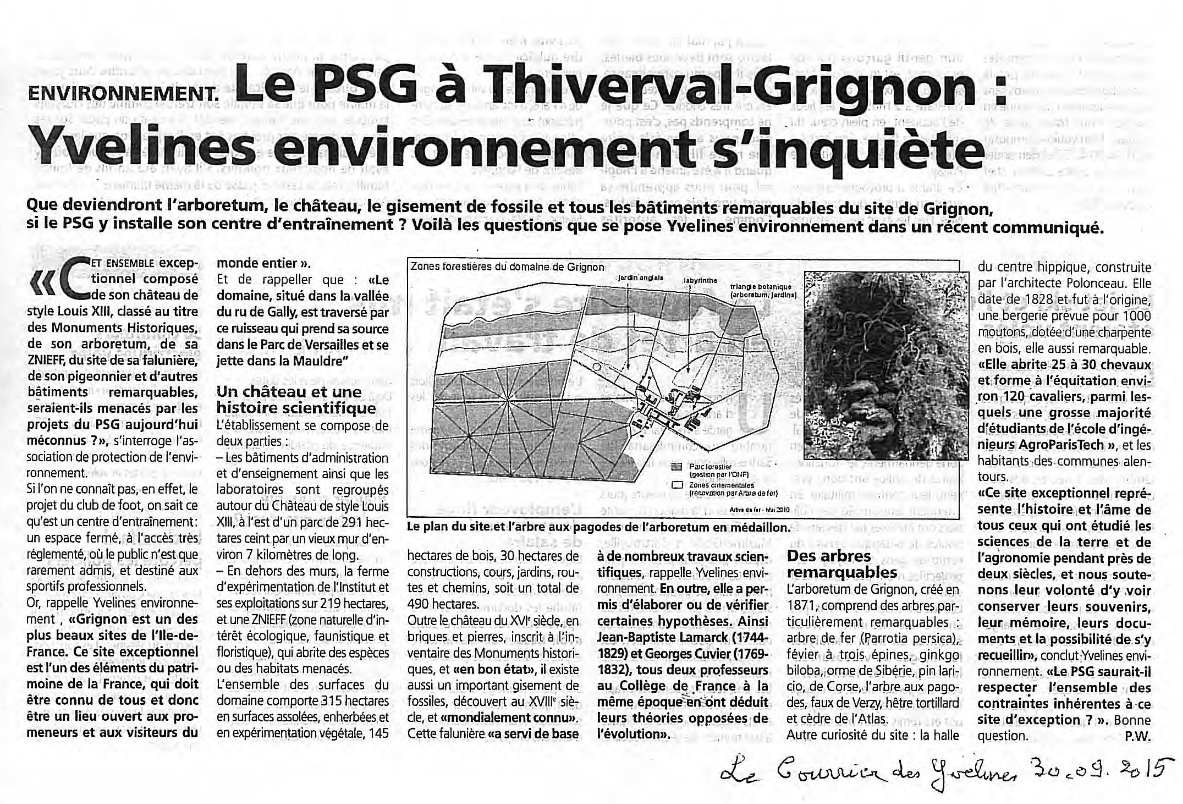 Dès 2015, il avait été évoqué publiquement une vente du domaine au club de football Paris-Saint-Germain (PSG) pour son futur centre d’entraînement (Poissy choisi au final en juin 2016), puis au Qatar pour une résidence de prestige. On peut entre autres consulter un éditoral du maire de Thiverval-Grignon et un article du Courrier des Yvelines publiés en septembre 2015, en décembre un article de Capital évoquant un montant de 34 millions d’euros et un article du Figaro sport sur un projet pharaonique à 300 millions d’euro, le billet de Denis Cheyssoux dans son émission CO2 mon amour du 20 février 2016, un reportage de Reporterre du 10 mars puis du 19 mai,  un article du Monde le 14 mars, un article de l’Express du  24 mars. Une mobilisation citoyenne avait alors permis de contrer ce projet.