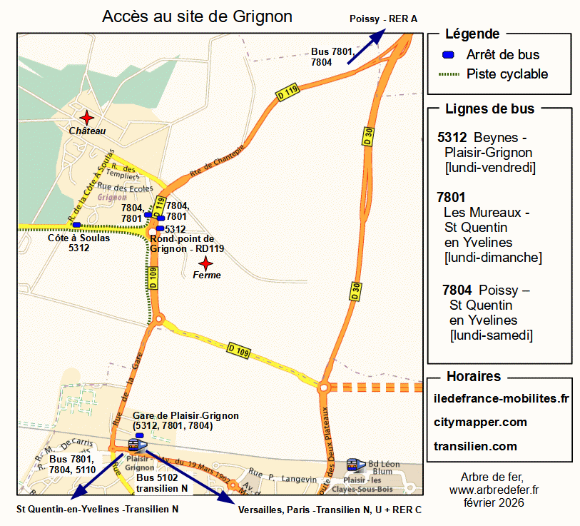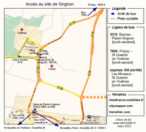 Voici un indicateur horaire synthétique des trains et bus entre la Gare de Paris-Montparnasse et Grignon (mise à jour en mars 2025, après la disparition de la ligne 19 entre la gare de Plaisir-grignon et le campus de Grignon).