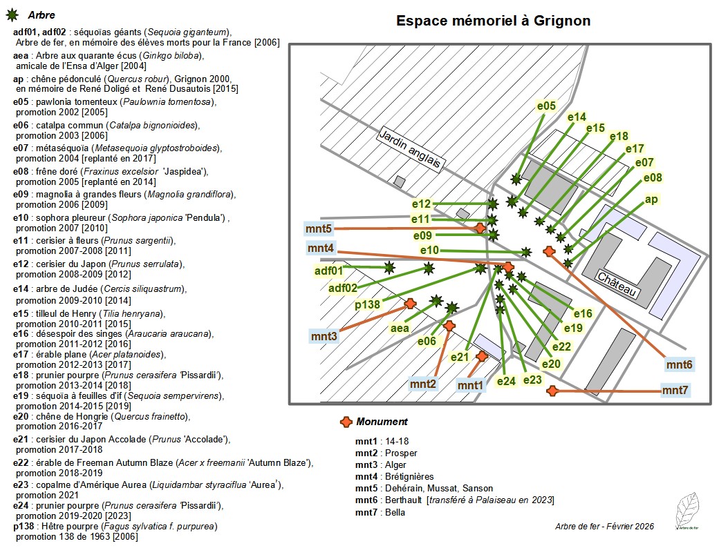 Outre les arbres des promotions récentes plantés à partir de 2005, les pelouses de l’espace mémoriel situées près du château accueillent aussi :